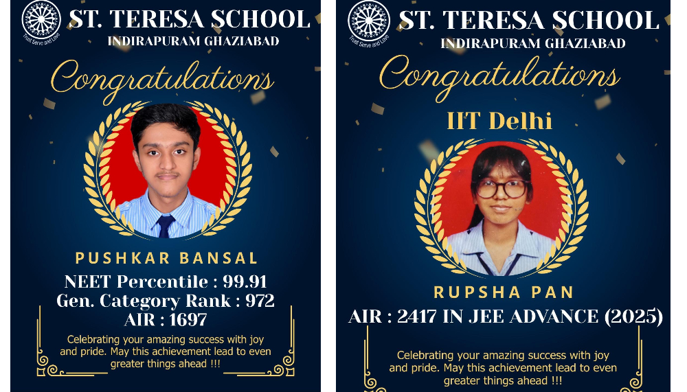 With immense pride and heartfelt joy, we celebrate the outstanding achievements of our brilliant Teresians! Rupsha Pan has secured an impressive AIR 2417 in JEE Advanced 2025, paving her way to the prestigious IIT Delhi, while Pushkar Bansal has made us proud with an extraordinary 99.91 percentile in NEET and a General Category Rank of 972 (AIR 1697). Their achievement speaks volumes of their academic excellence and focused perseverance. At. St. Teresa School, Indirapuram , we believe in nurturing minds that soar beyond limits. May these milestones be the prologue to even greater chapters in their scholarly journey.